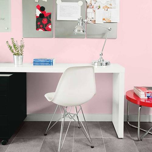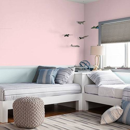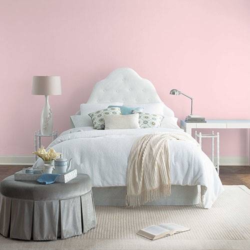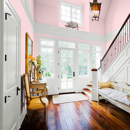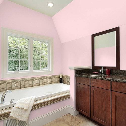 This powder pink is a wonderful treat for a romantic bathroom. Apply touches of effervescence greens for a complementary area.