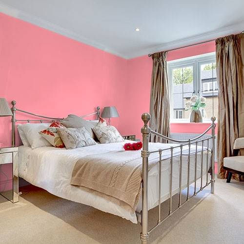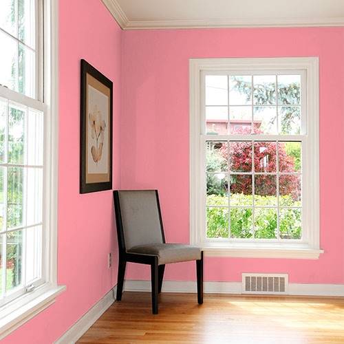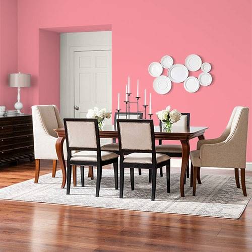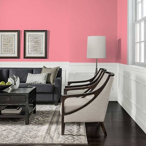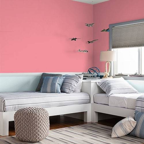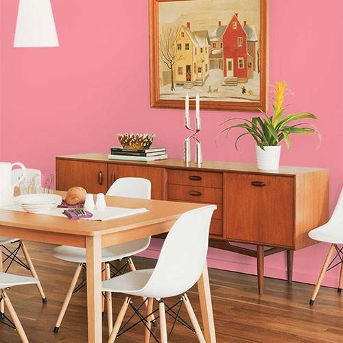 A dramatic pink that is perfect for a teen room. Select graphic prints for the walls and a varying assortment of green accents in this area.