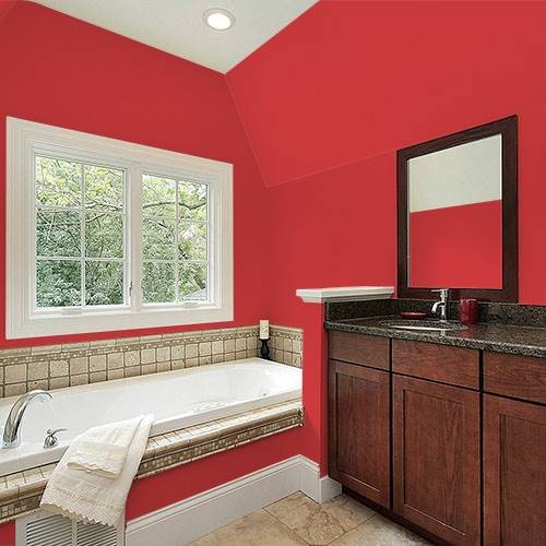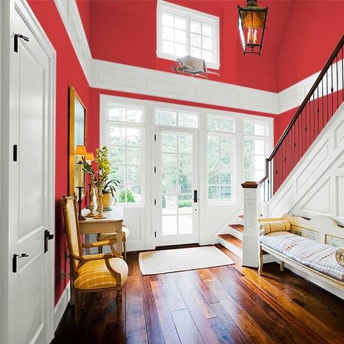 A zesty punch of red radiates warmth for any living space of choice. Off white trims and camel golds pair elegantly with this color.
