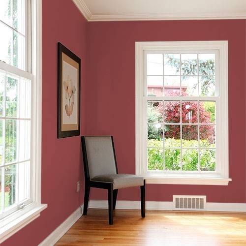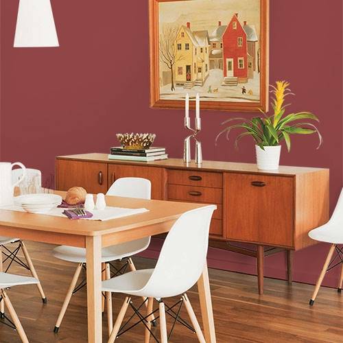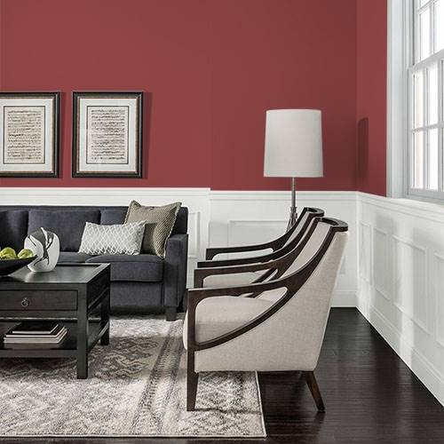 This prominent deep red is a perfect accent wall. Golds and greens coordinates beautifully with this statement color.