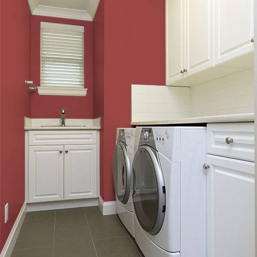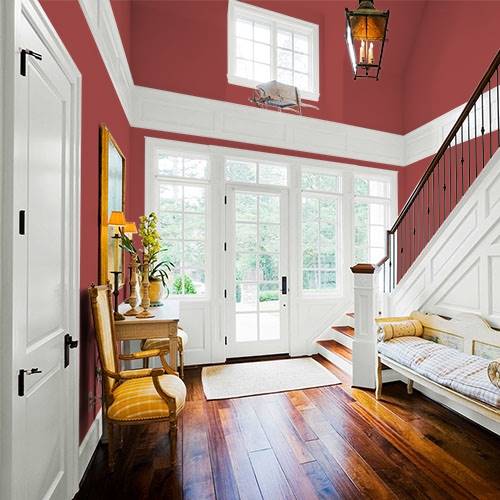 A warm based red is stunning for a bedroom area. Lighter shades of creams and earth toned greens bring harmony to this cozy atmosphere.