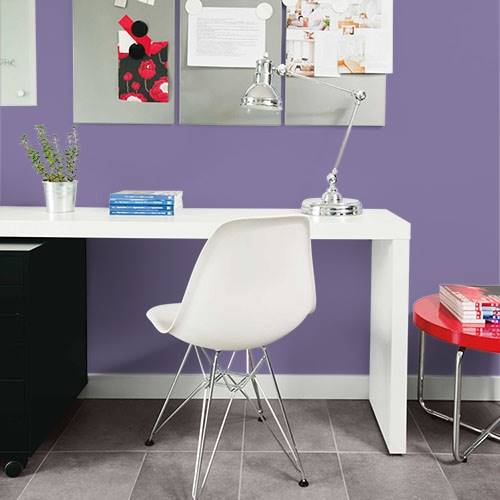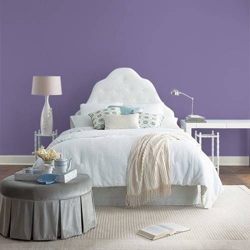 This midtoned plum creates an elegant accent wall in a bedroom. Sophisticated brown tones work well as accessories for this area with lighter walls of golden neutrals.