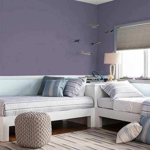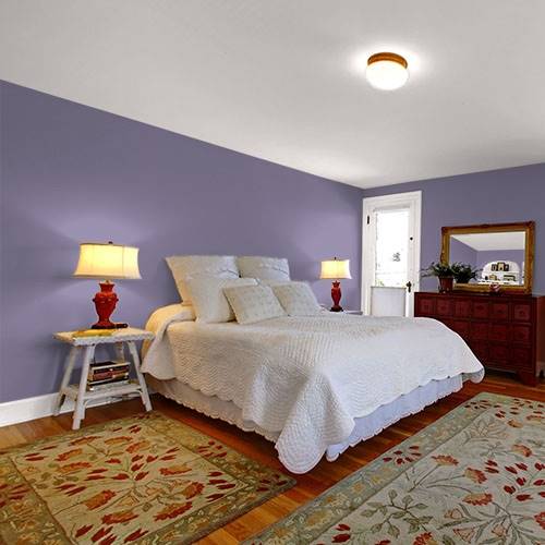 This midtoned violet could be used on all main walls. Lighten golden accents on window treatments and bedding will contrast nicely with this color.