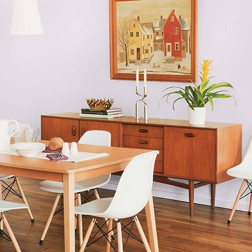 This violet is a perfect trim color for deeper violets in the same color family. Pair warm woods to add a visual contrast.