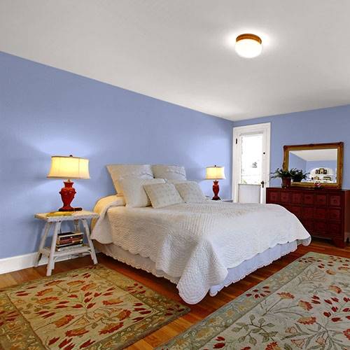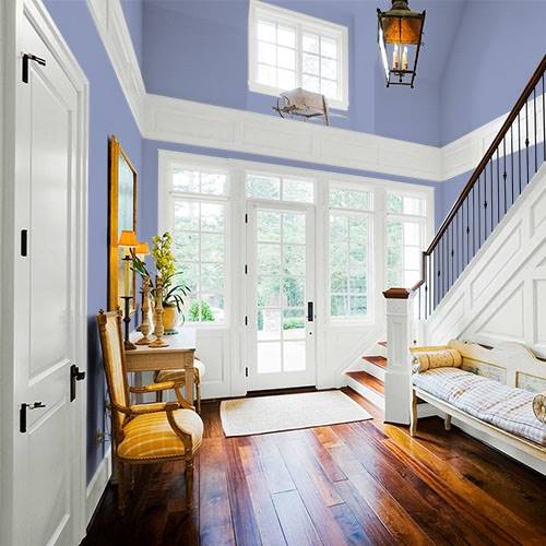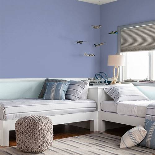A Smokey blue violet is perfect for an accent wall. Pair with light tans to balance the surrounding walls.