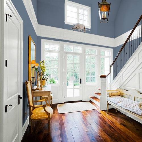 A beautiful slated blue is perfect for a living room. Restful and calming this blue creates a spirit of serenity.