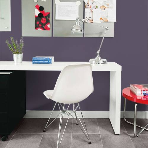 A darkened plum creates a dramatic half bathroom. Brushed gold fixtures pair nicely with this color.