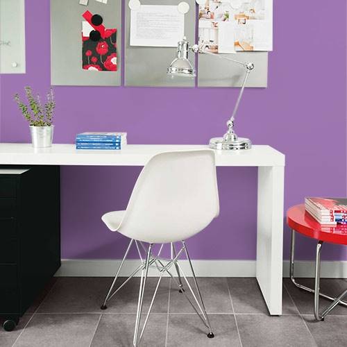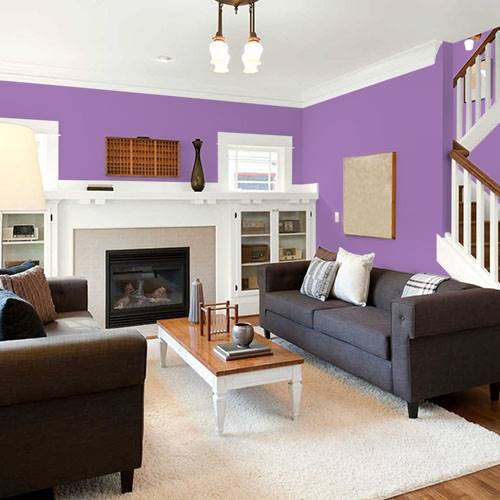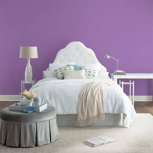 A brilliant violet is applied on an accent wall. Trim this color in whites and add lighter gray tones for surrounding walls.