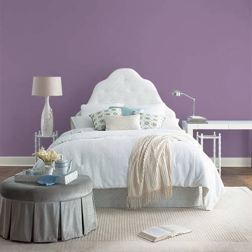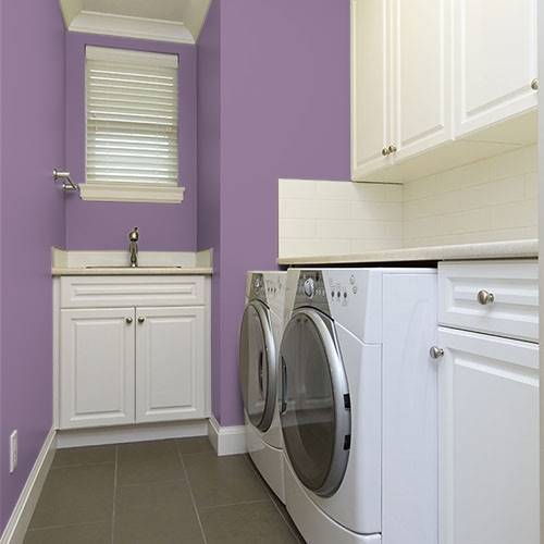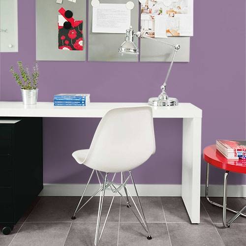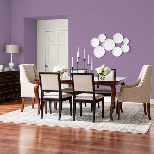 Apply this midtoned violet for an accent wall in a dining room. Select lighter goldtones for the surrounding walls.