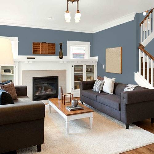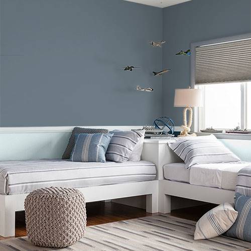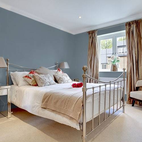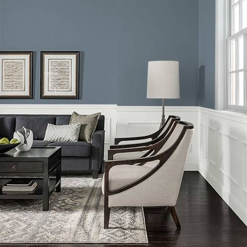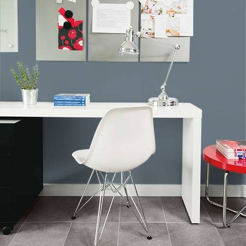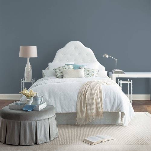 A complex blue gray creates a beautiful ambiance for an accent wall. Pair Parisian accents of violets and lighter gray walls for surrounding walls.