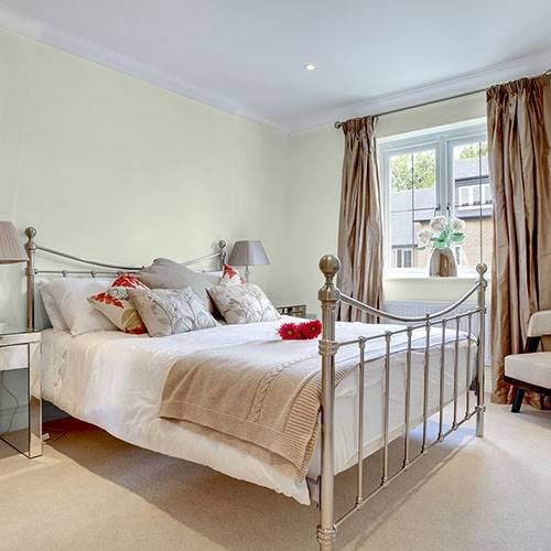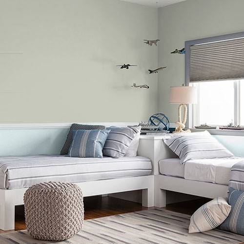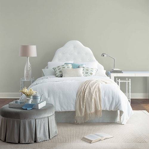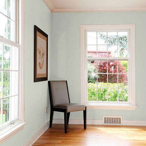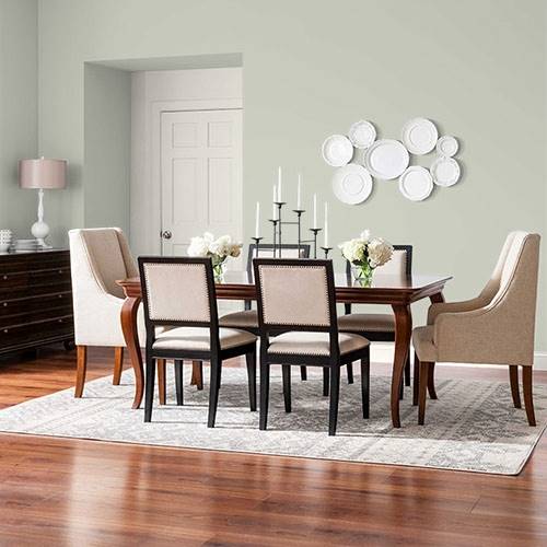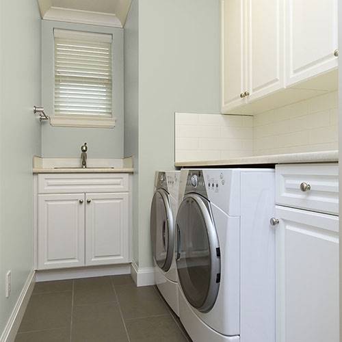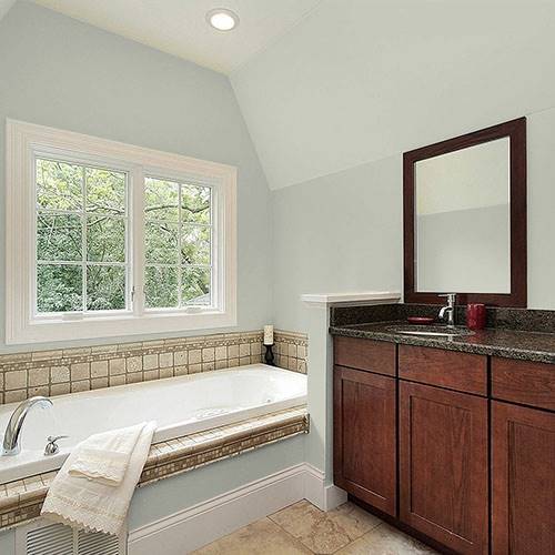 This lighter sage is a cozy color that can be used in a bathroom. Adding contrasting cabinetry of dark woods pairs nicely in this space.