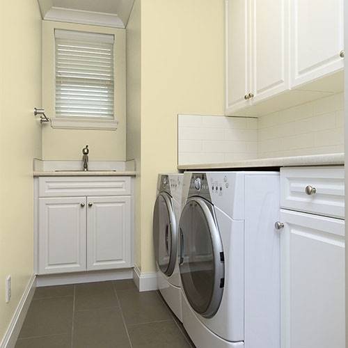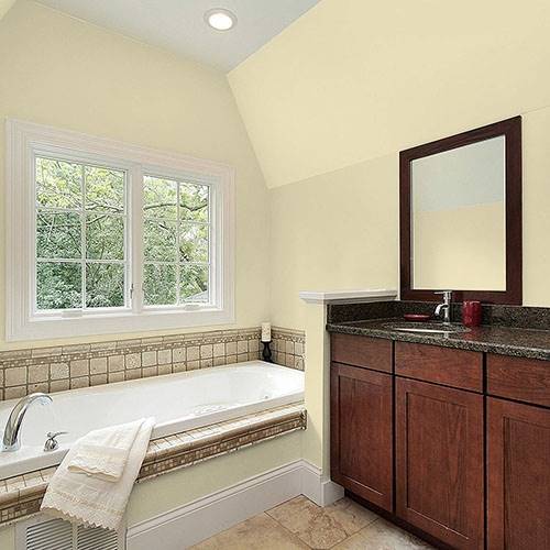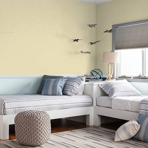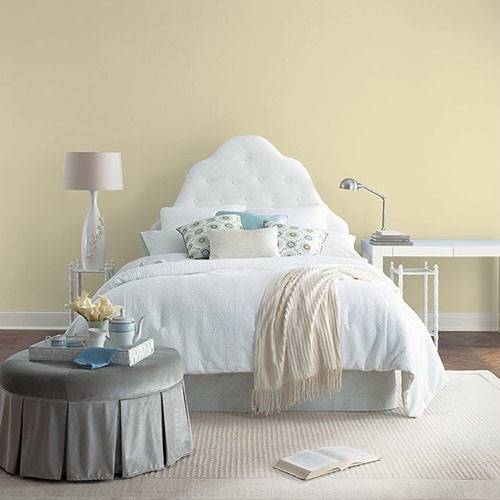 This hazy yellow cream is beautiful in a living room. Coordinate dark brown sofas and plum pillows for accents.