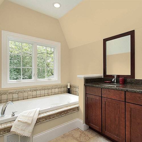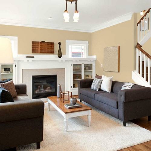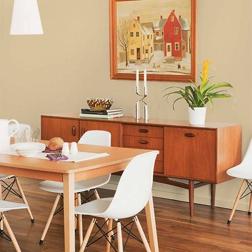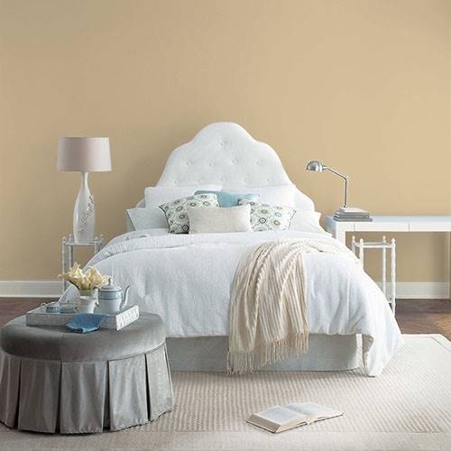 This wonderful neutral gold is fashionable in any interior space. Trim in off white and pair pops of plums and sage greens for accents.