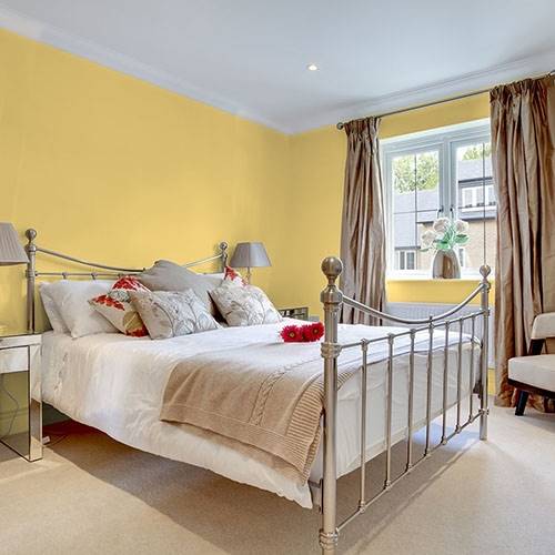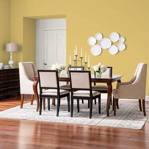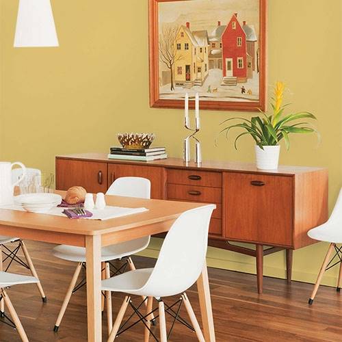 A dusty gold is quite glamorous in a living room. Pair lighter golds and grayed purple accents in this setting.