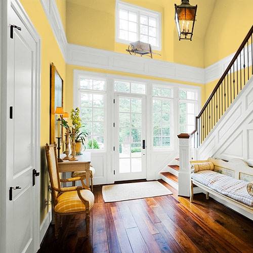 A lively dancing yellow creates an inviting wall for a kitchen area. For a crisp clean essence pair with white trim.