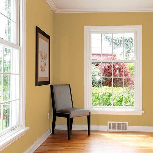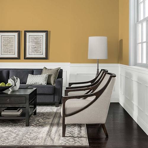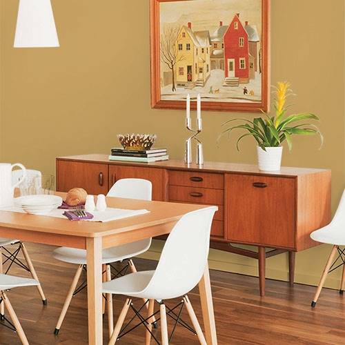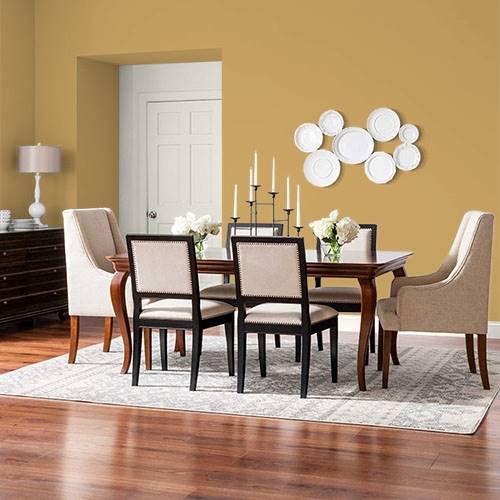 A refined gold delights the wall of a dining room area. Contrasts of plums, greens and reds harmonize this elegant appeal.