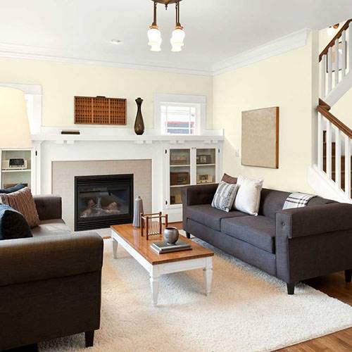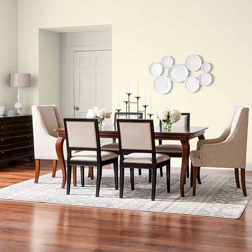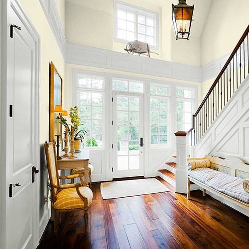 This incredibly soft yellow is perfect for a dark hallway. Pair this color with white trim and apply camel colored accents in adjoining rooms.