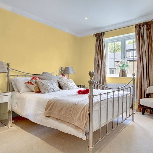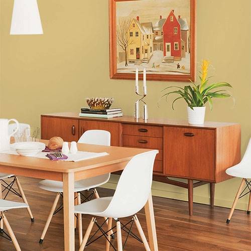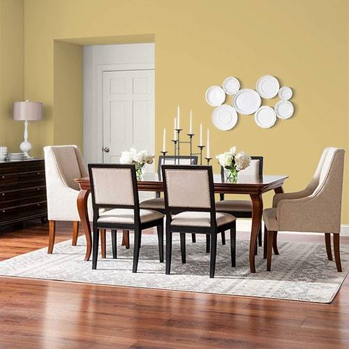 A muted gold creates an elegant dining room. Pair with plum and rusts accents in floral patterns for this space.