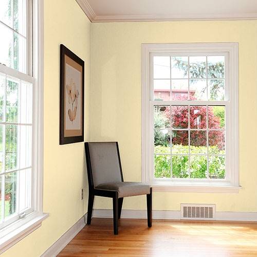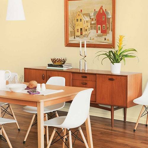 This subdued soft yellow is a favored main color. It pairs elegantly with plum and teal accents.