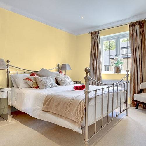 Liven up a breakfast nook with an accent of this brilliant yellow. Surround your space with off whites and pops of sage green accents.