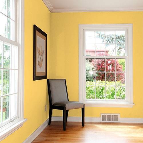 This radiating yellow supports an accent wall. Pair with whites and other bright colors to create a graphic and lively space.