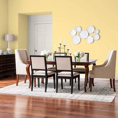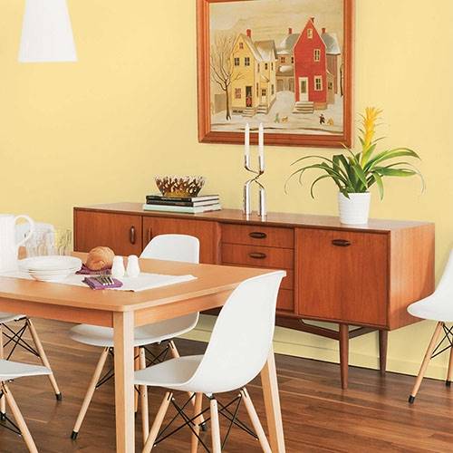 This welcoming yellow creates an inviting kitchen. Apply white trim and contrast with pops of floral inspired colors of reds, corals and blues.