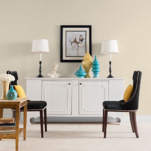 Off-Whites will work on any interior wall, which is why they’re one of the most favorite color families. With off-whites, lighting is key to help make your wall color look its best. For colors like Glazed Pears and Bone White, soft interior lighting brings out the tan tones.Off-whites work with either pale or bold colors - so you can’t go wrong!
