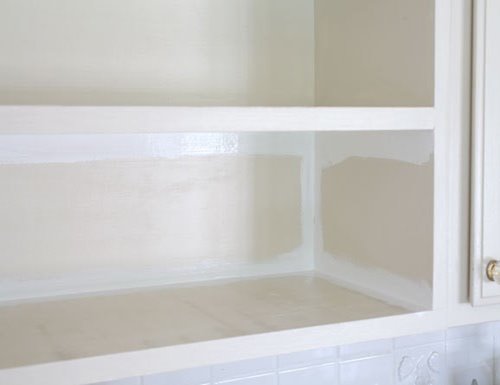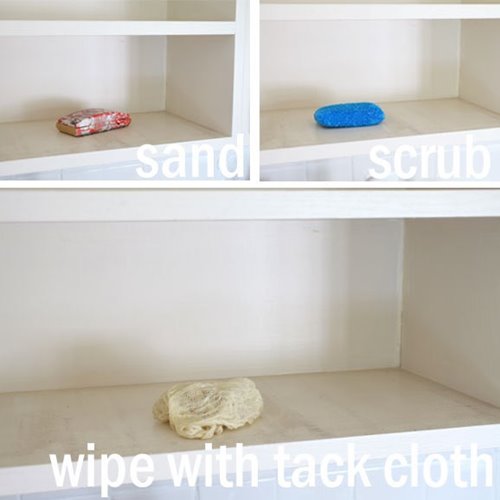 Kitchen cabinet shelves can get pretty dirty if they store food. Paint will not adhere to any greasy or gooey spots. Sand*, scrub, and let dry. Wipe with a tack cloth to make sure all the dirt and crumbs are gone.Find The Right Paint Products For Your Project