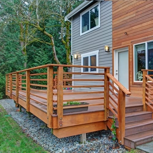 If you want to make your deck floor the focal point, stain your floor boards a shade or two lighter than your home’s base color.