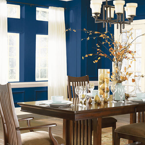 Deep blue paint colors give a dining room an impressive look. Dark furniture will stand out against this backdrop, and white or off-white trim and curtains make the room pop.