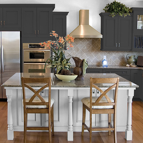 If your kitchen is frequently used to entertain guests, painting your cabinets in a dark, dramatic black catches the eye right away and is sure to get you compliments. Black shades are great colors for kitchen cabinets because while the shade may be eye-catching, it can blend well with many other dark paints without clashing. Black also pairs well with a white kitchen. If you're really looking to make a statement, consider using our Color Of The Year Black Flame in your kitchen to create a space that guests won't soon forget.