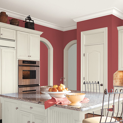 Warm tones, especially intense red shades, are shown to stimulate the appetite. Grenadine will make any color of cabinets stand out, but looks especially amazing with white. Choose white cabinets with quaint hardware for a country cottage feel or pick sleek and shiny white cabinets without handles for a more modern look. If you're scared of painting your entire kitchen a bright shade, start with an accent wall.