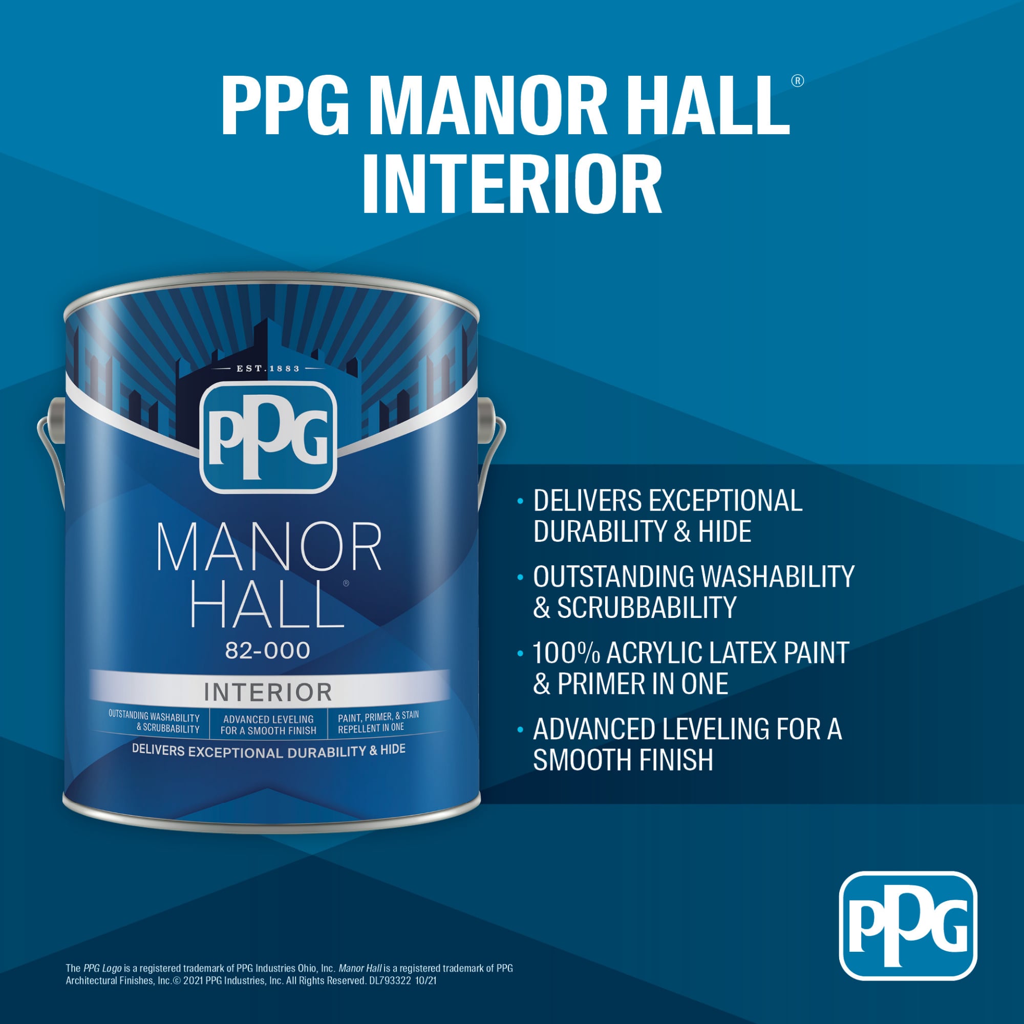 Manor Hall Interior Paint & Primer in One is a Zero VOC* super premium latex that was developed to resist household stains through the combination of resin and proprietary formulation. The 100% acrylic latex has outstanding adhesion and coverage and offers a burnish and mildew resistant coating, providing the durability for use in high humidity and high traffic areas. Outstanding hiding is aided by excellent flow and leveling which provides a rich, smooth film for a beautiful finish. Now available as a Zero VOC* product!